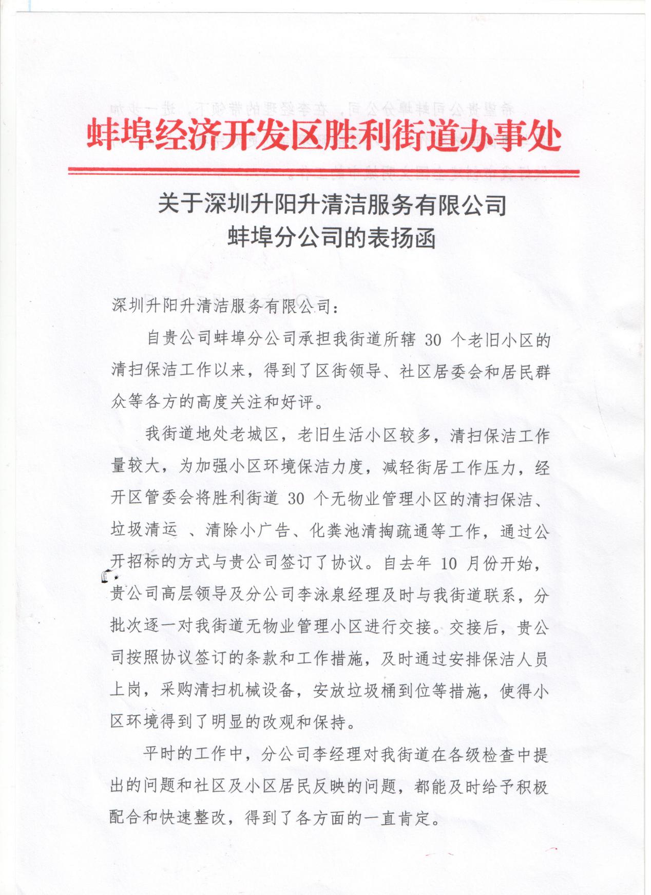 二、蚌埠市經(jīng)濟(jì)開發(fā)區(qū)龍湖街道辦事處和勝利街道辦事處對(duì)蚌埠項(xiàng)目近半年的工作給予了工作主動(dòng)、管理規(guī)范、措施到位、態(tài)度認(rèn)真的高度評(píng)價(jià),贏得了區(qū)街道領(lǐng)導(dǎo)和居民群眾的一致好評(píng)。