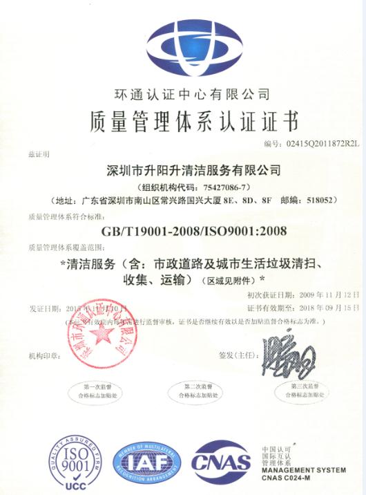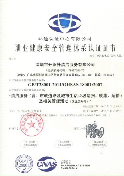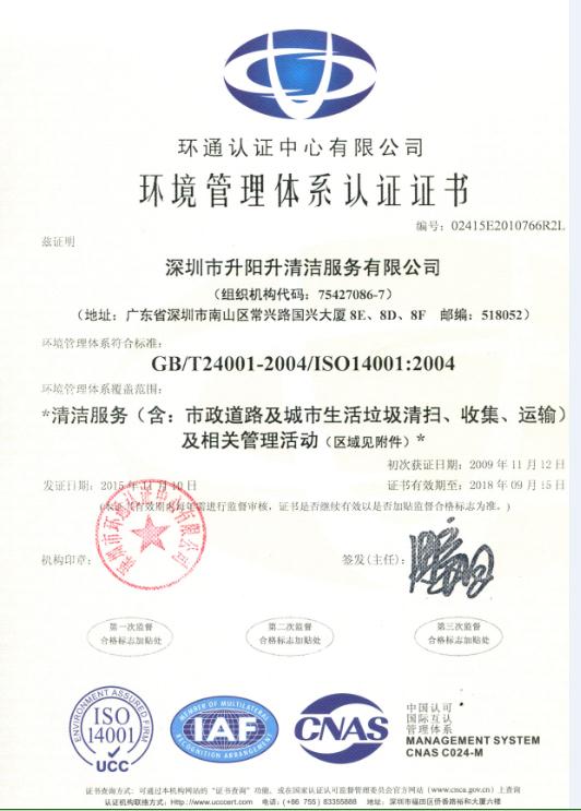 10月9日,深圳市環(huán)通認證中心有限公司九位專家對深圳市升陽升清潔服務有限公司的質(zhì)量管理體系(ISO9001:2008)、環(huán)境管理體系(ISO14001:2004)和職業(yè)健康安全管理體系(OHSAS18001:2007)三體系進行了為期五天再認證審核。經(jīng)過專家組認真、嚴謹?shù)膶徍耍?span style="box-sizing:border-box;border-top:0px;font-family:inherit;border-right:0px;vertical-align:baseline;border-bottom:0px;padding-bottom:0px;padding-top:0px;padding-left:0px;border-left:0px;margin:0px;padding-right:0px;font-stretch:inherit;">2015年11月3日公司順利通過了“三體系”現(xiàn)場審核工作并取得新的證書,確保了公司“三體系”的正常運作。