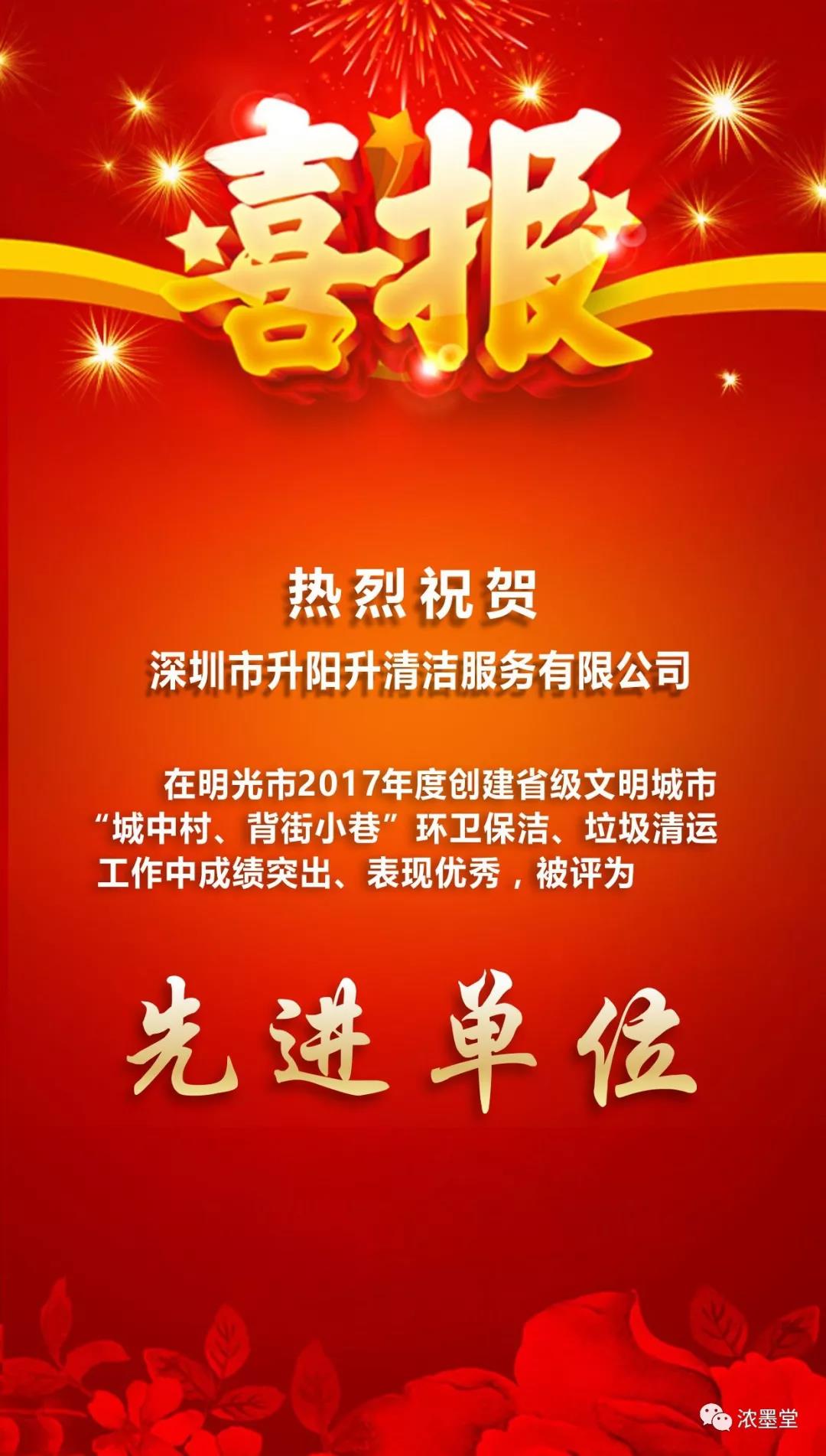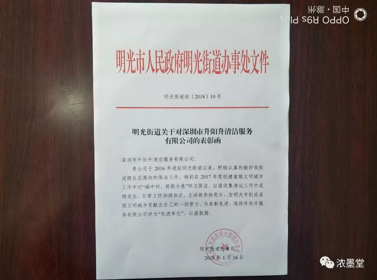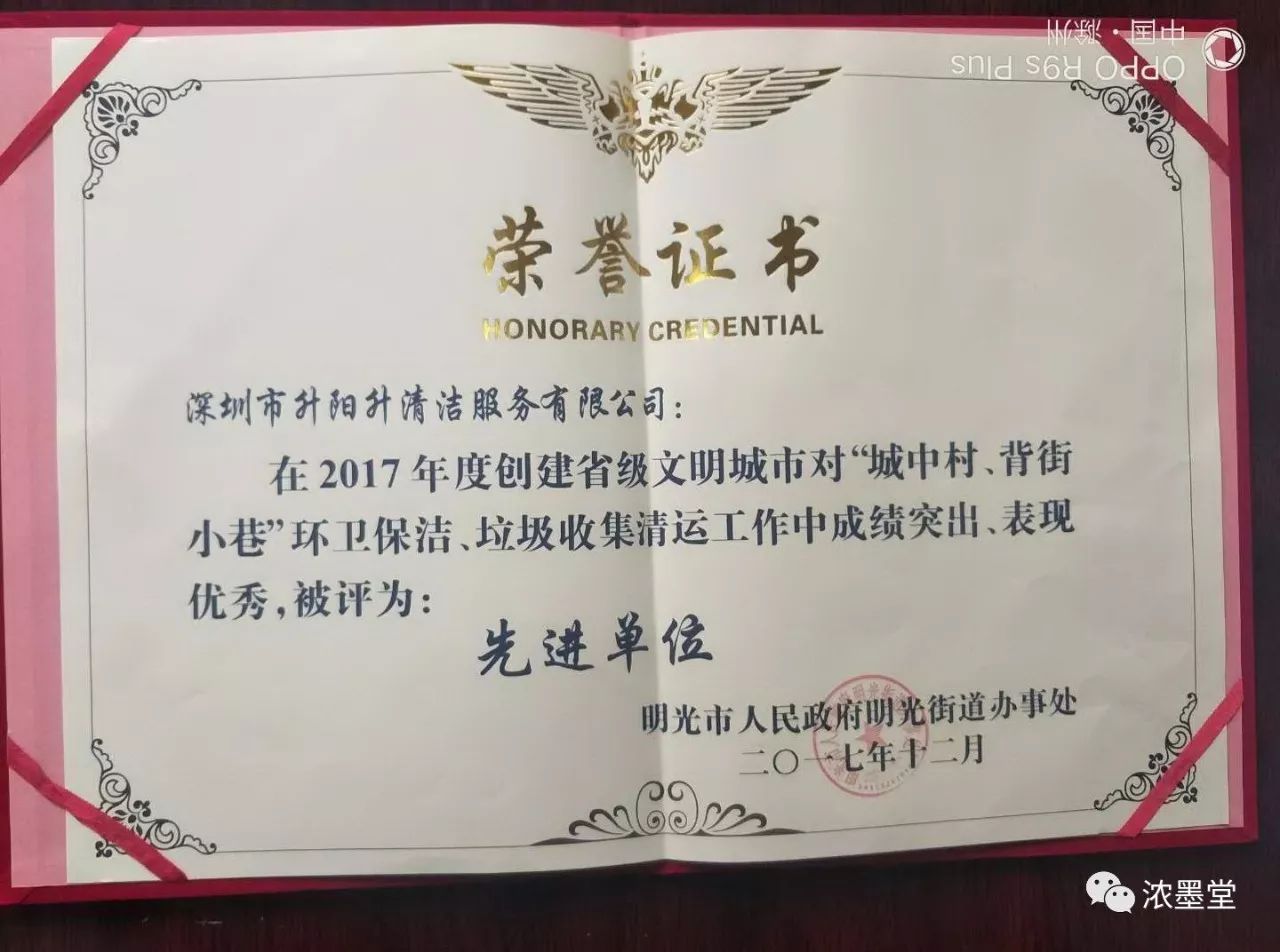 升阳升清洁在明光市2017年度创建省级文明城市环卫中成绩突出、表现优秀,被评为“先进单位”